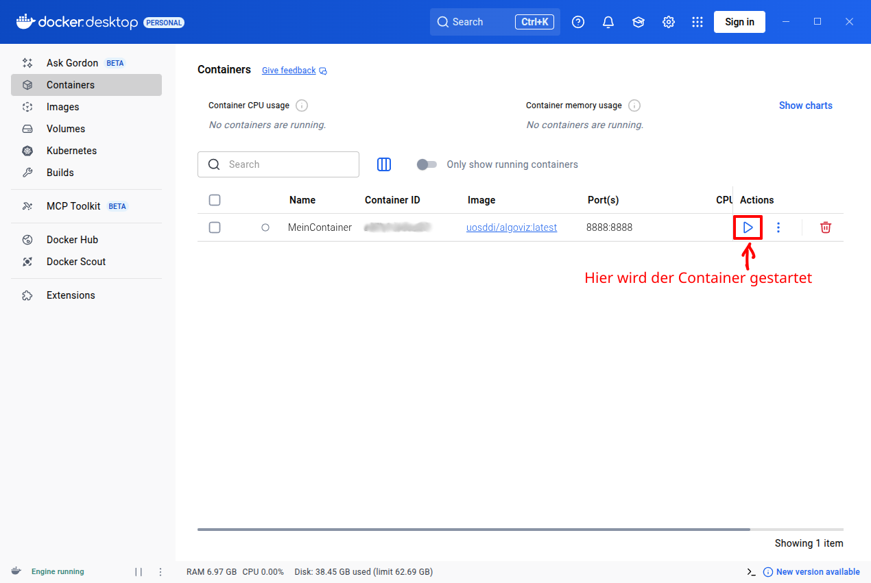 Wenn Sie ein Verzeichnis ausgewählt haben, klicken Sie auf Run. Dadurch wird eine virtuelle Maschine gestartet, die das Image ausführt. Diese nennt man einen Docker Container.