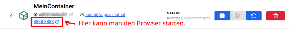 Möchten Sie den Container später erneut starten, gehen Sie in Docker Desktop DIREKT zur Container Sicht und starten Sie den Container. STARTEN SIE NICHT ERNEUT DAS IMAGE! Das würde einen weiteren Container erzeugen! Ist der Container gestartet, öffnen Sie über OPEN IN BROWSER den Browser. Alternativ können Sie nach dem Start einen Browser öffnen und zur URL https://localhost:8888